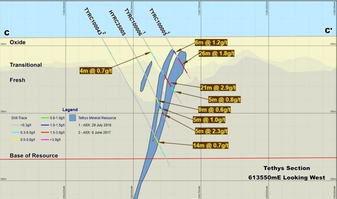 Figure 4: Tethys mineralised section at 613550mE, looking west, illustrating mineralised zones and drill intersections [Prodigy Gold]