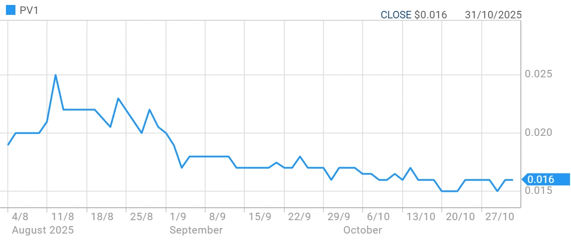 As of 31st October 2025, Provaris Energy shares traded at AUD 0.016 per share. The Company’s market capitalisation stood at AUD 13.68 million, with a 52-week trading range of AUD 0.008 – AUD 0.027.