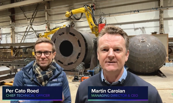 A short video has been released on YouTube featuring Provaris CEO Martin Carolan and CTO Per Roed onsite, providing an explanation of the Robotic Cell and prototype tank. The YouTube update begins with Martin addressing viewers directly: “Hi everyone. Here I am with our CTO, P Road. We’re on site at Fiska where we are constructing the prototype. As you can see behind me, we’ve got the installed robots and tank sections in progress.”