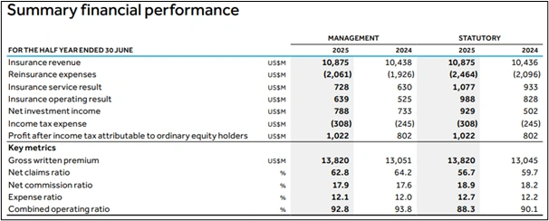 QBE reported statutory profit after tax attributable to ordinary equity holders of USD 1,022 million for the half year ended 30 June 2025. This represents a substantial increase from USD 802 million in the prior corresponding period. The Company’s combined operating ratio improved to 92.8% from 93.8% in the prior period.