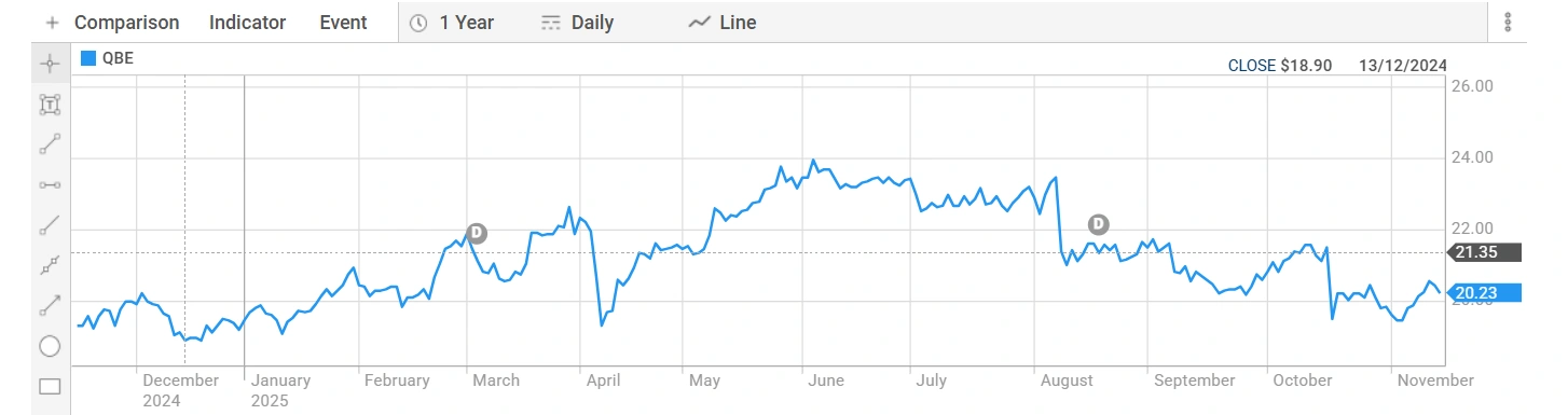 QBE shares trade at AUD 20.255 on the ASX. The Company’s market capitalisation stands at AUD 30.89 billion. The 52-week range spans AUD 18.380 to AUD 24.200 per share.