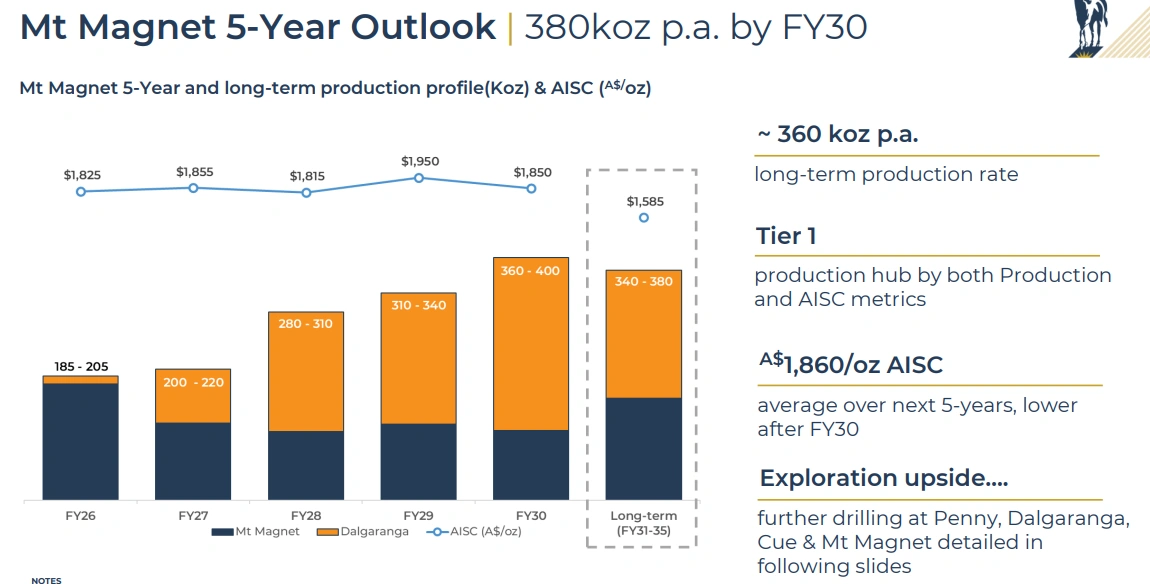 Ramelius Resources 5-year gold production roadmap shoes the integration of Dalgaranga into the Mt Magnet Hub generates approximately AUD 1 billion in total synergies. Capital savings of around AUD 100 million arise from utilising a single upgraded Mt Magnet plant versus two separate processing facilities.