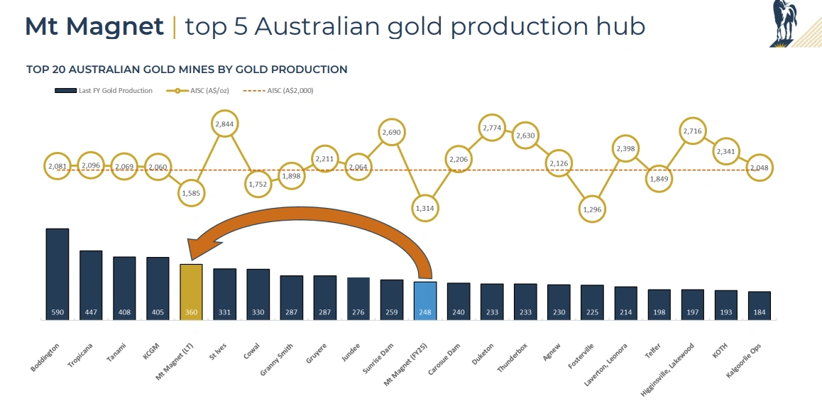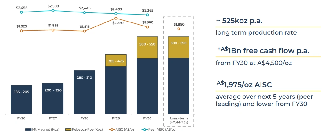 Production averages 175,000 ounces between FY27 and FY36 at an AISC of AUD 1,128 per ounce. Total production of 9.3 million tonnes at 6.45 grams per tonne delivers 1.8 million ounces of recovered gold. The project bears the full cost of Mt Magnet mill upgrades, totalling AUD 223 million.