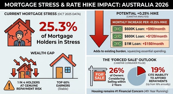 Australian households face considerable pressure from elevated housing costs already. Research shows that 25.3% of mortgage holders experienced stress in October 2025, even after rate reductions. Canstar analysis indicates that each 0.25% increase adds between $90 and $150 monthly to mortgage repayments for loans between $600,000 and $1 million.​