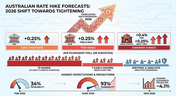 Major Australian banks have revised forecasts dramatically in recent weeks. The Commonwealth Bank expects a 0.25% point increase in February, bringing the cash rate to 3.85%. National Australia Bank predicts two hikes occurring in February and May. Judo Capital Holdings takes a more hawkish stance, forecasting a 0.4% point rise in February, followed by consecutive 0.25 point increases.​