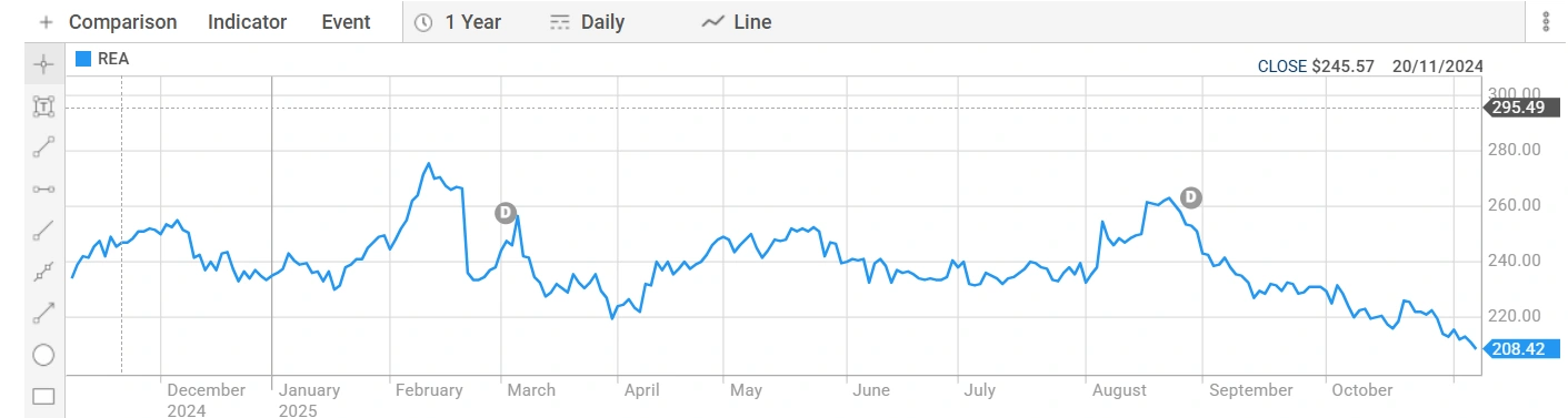 REA Group stock is priced at AUD 210.985, with a bid/offer range of AUD 210.980 to AUD 210.990 per share. The Company has a strong market capitalisation of AUD 27.90 billion, indicating investors’ trust in the market leadership position and growth strategy. The Real Estate technology, or Property Tech, space remains strong as digital adoption in real estate across Australia continues to grow.