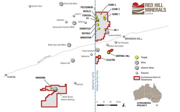 Figure 3: Curnamona Joint Venture location plan highlighting key targets and earn-in tenements [Red Hill Minerals Limited]