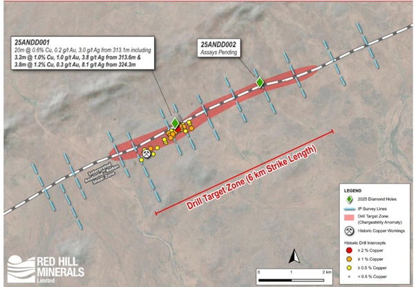 Figure 4: Diamond drill hole locations and assay results at the Anabama Copper-Gold Target [Red Hill Minerals Limited]