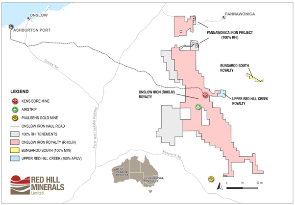 Figure 6: Pannawonica Iron Project location showing royalty areas, haul road access, and regional infrastructure [Red Hill Minerals Limited]