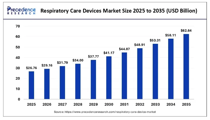 The global respiratory care devices market is set to grow from $26.76 billion in 2025 to $62.64 billion by 2035, a market in which ResMed is uniquely positioned to dominate. (Source: Precedence Research)