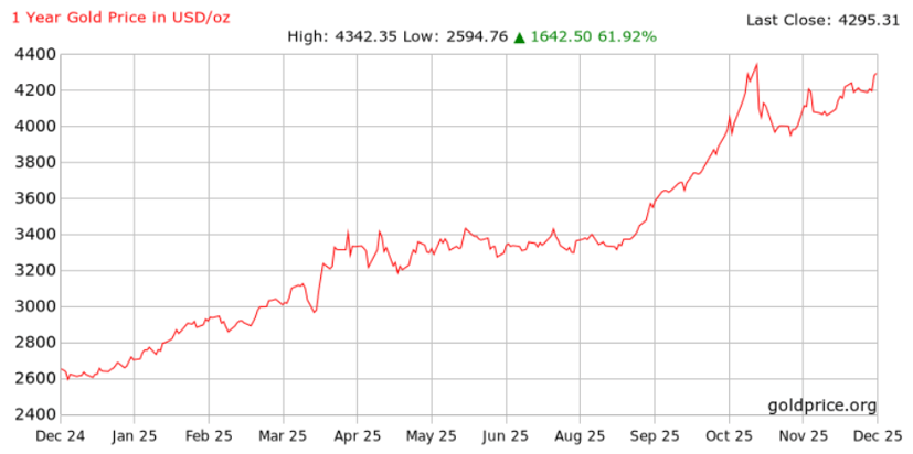 Figure 7: Gold price performance chart showing 1-year trend, reaching USD 4,322.99 per ounce as of 15 December 2025