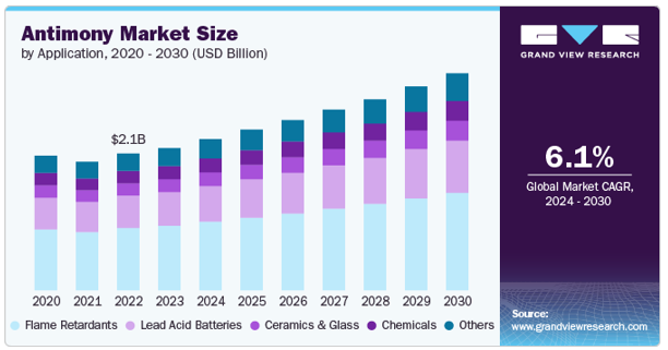 According to Grand View Research, the global antimony market is projected to grow from USD 2.17 billion in 2023 to USD 3.30 billion by 2030, representing a CAGR of 6.1%. The metal’s critical role in flame retardants, lead-acid batteries, and semiconductors makes it essential for both legacy and emerging technologies.