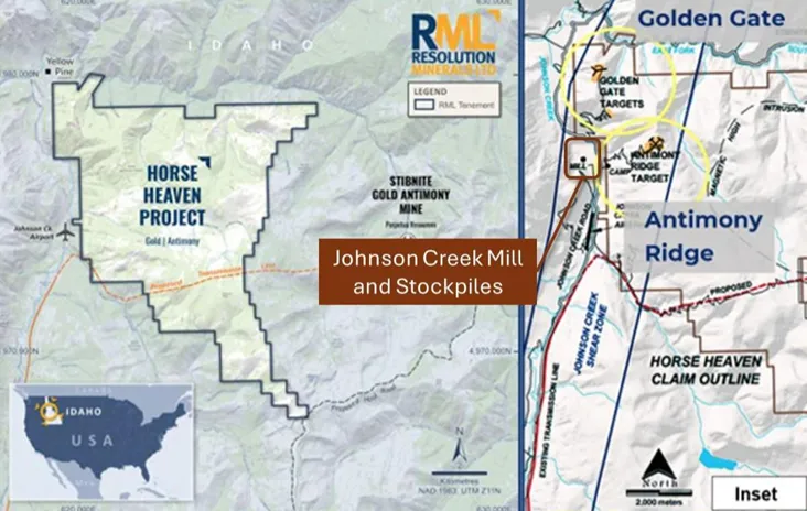 Figure 3: A project location map highlighting the Johnson Creek Mill, site of the stockpiles, alongside the key prospects of the Horse Heaven Project, including Golden Gate and Antimony Ridge. [Resolution Minerals]