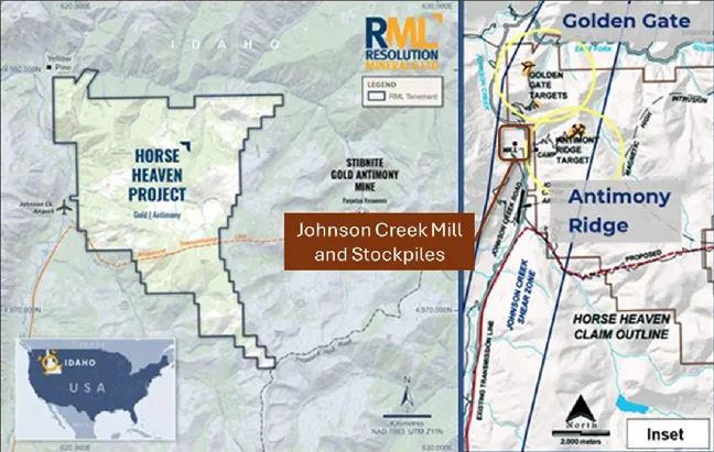 Figure 6: Project location map highlighting the Johnson Creek Mill, the stockpile area, and key prospects within the Horse Heaven Project including Golden Gate and Antimony Ridge. [Source: Resolution Minerals]