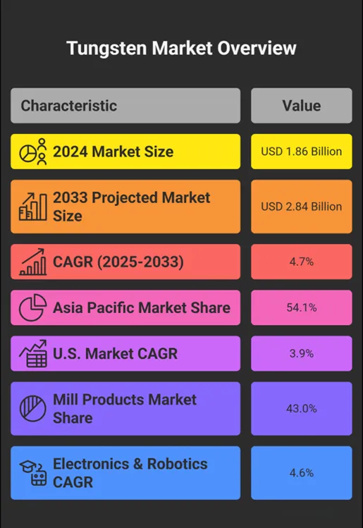 This urgency is mirrored globally. Valued at USD 1.86 billion in 2024, the tungsten market is forecast to reach USD 2.84 billion by 2033, growing at a CAGR of 4.7%. Key demand drivers include: