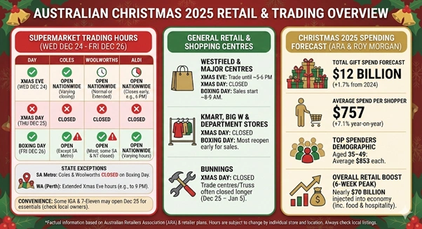 Shoppers must complete supermarket visits before Christmas Day arrives. Coles, Woolworths, and Aldi will all close completely on Thursday, 25 December. The Australian Retailers Association reported consumers plan to spend an average of $757 per person. Total gift spending across Australia is forecast to reach $12 billion this year.