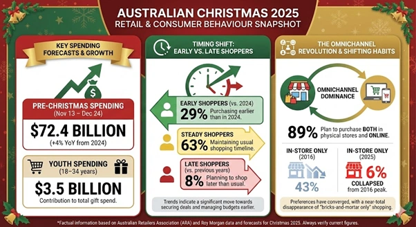 Australian consumer behaviour shows significant shifts during the festive season. Data from the Australian Retailers Association and Roy Morgan indicates 29 per cent of shoppers are purchasing gifts earlier than in 2024. Only 8 per cent plan to shop later than previous years.