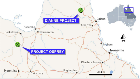 Location map of Revolver Resources‘ Dianne and Osprey copper projects in Queensland.