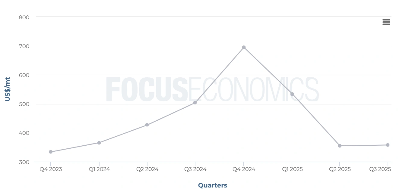 Australian alumina prices dropped sharply to US$355 per tonne FOB Brisbane in Q2 2025. That marked a 28.72% decline from the previous quarter. The steep fall reflected rebounding supply after major output curtailments in 2024.