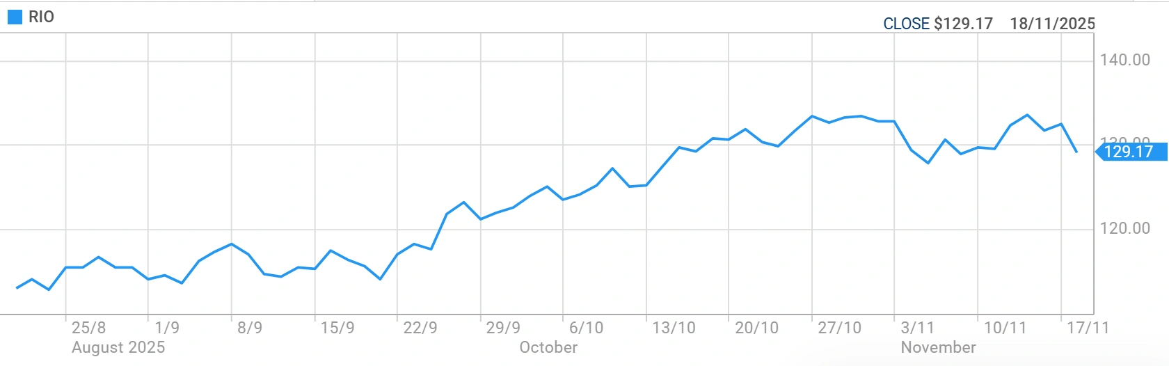 Rio Tinto shares (ASX: RIO) traded at $129.27 as of 18 November 2025. The stock sits within a 52-week range of $100.750 – $135.240. The company maintains a market capitalisation of approximately $49.21billion.