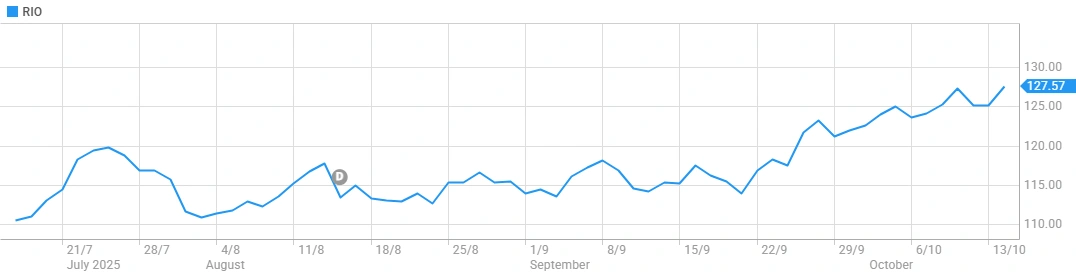 As of 14 October 2025, Rio Tinto shares trade on the ASX at $127.57, within a 52-week range of $100.750 – $130.230. The company commands a market capitalisation of approximately $46.47 billion.