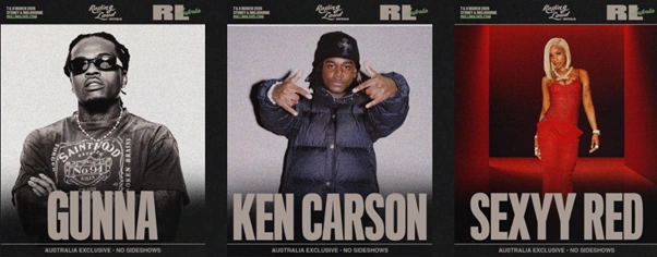 The Rolling Loud Australia 2026 lineup combines established rappers and emerging names in hip hop. International arrivals feature Gunna, Ken Carson, Tyga, Swae Lee, Lil Tjay, NLE Choppa, Quavo, Ski Mask The Slump God, iAN, Osamason, and Rich Amiri. Organisers also spotlight festival favourites like Robb Bank$, Ian, and Moses & Taktix. National talent bolsters the bill, with artists such as Hooligan Hefs, Youngn Lipz, Day1, Amarni, Lil Golo & Cult Shφtta, 4ourttune, Jonny Chopps, and more.​
