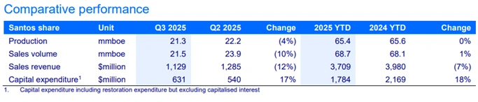 Santos reported free cash flow from operations of approximately USD 300 million in the third quarter of 2025. Year-to-date free cash flow from operations reached approximately USD 1.4 billion for the period ending 30 September 2025.