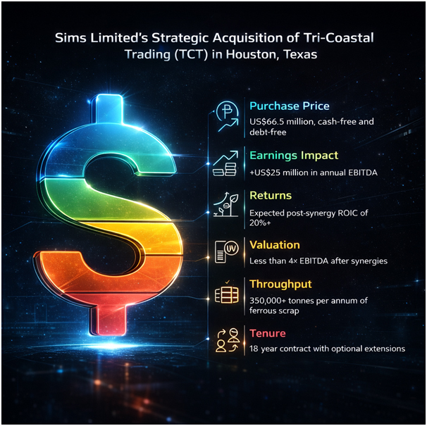 Sims Limited has launched a bold strategic move in North America, announcing the US$66.5 million acquisition of Tri-Coastal Trading (TCT) in Houston, Texas, a transaction the Company says will structurally lift margins, consolidate its regional footprint and unlock more than US$100 million in surplus land value within two years.