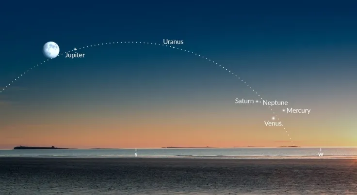 During this alignment, observers will see the planets spread from the western horizon toward the southeast. The arc follows the natural curve of the ecliptic.