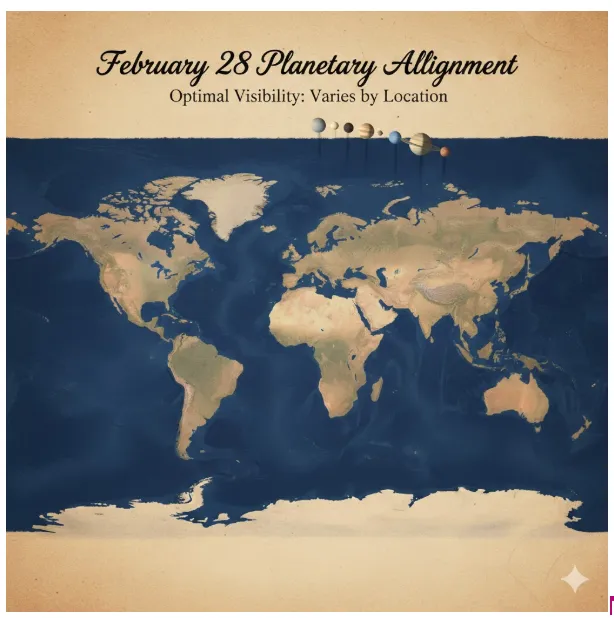 The February 28 planetary alignment will be visible worldwide, with optimal dates varying slightly by location.