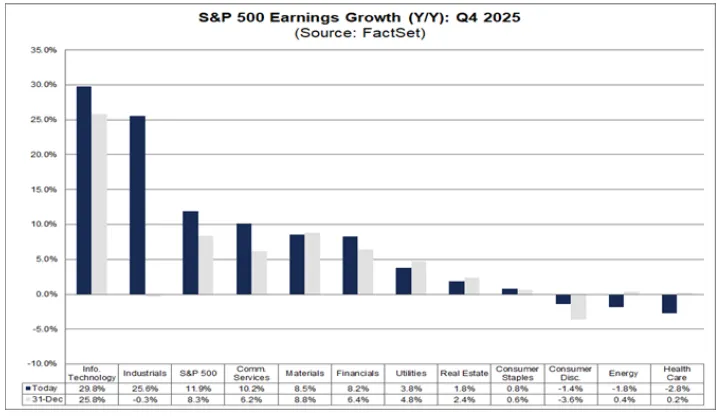Chart 1: S&P 500 Earnings Growth by Sector – Q4 2025 (Y/Y). Industrials posted 25.6% earnings growth in Q4 2025, the second-highest among all S&P 500 sectors and a dramatic reversal from the -0.3% recorded on December 31. Source: FactSet.