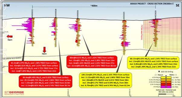 Figure 2: Cross-section illustrating niobium and rare earth mineralisation from surface across the northwest discovery zone at Araxá [Source: St George Mining]