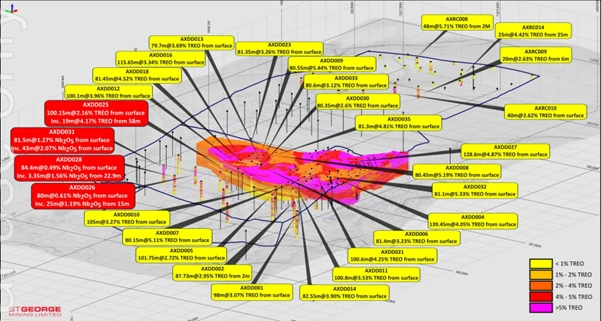 The latest drilling also confirmed rare earths mineralisation within the new zone. Hole AXDD025 returned 100.15m at 2.16% TREO from surface, including 19m at 4.17% TREO from 58m. Other holes intersected consistent mineralisation across both niobium and rare earths.