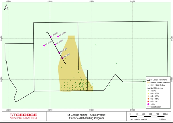 Figure 3: Plan view map showing St George Mining tenements, drill hole locations and mineral resource outline at the Araxá Project [Source: St George Mining]