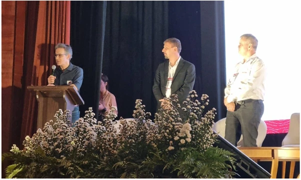 Figure 7: Minas Gerais Governor Romeu Zema speaking at the St George Open Day and Critical Minerals Forum in Araxá, observed by St George’s in-country leadership team, Thiago Amaral (second from left) and Adriano Rios (third from left). [St George Mining]