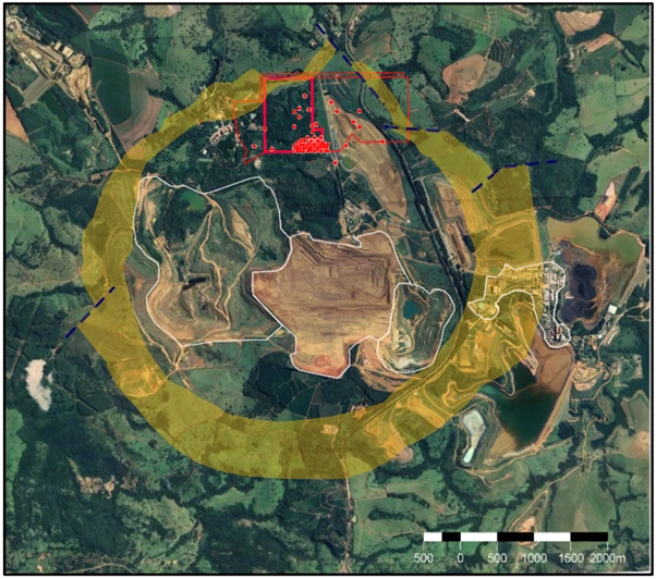 Figure 2: Aerial view of the Barreiro carbonatite complex highlighting the Araxá Project (outlined in red), alongside the neighbouring CBMM niobium operation and the Mosaic phosphate mine. [St George Mining]