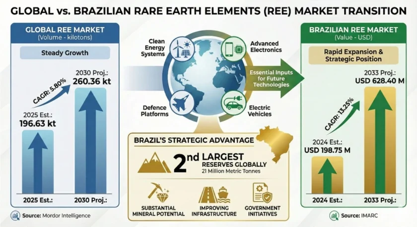 Brazil occupies a strategic position in this transition. IMARC estimates the Brazilian rare earth elements market reached USD 198.75 million in 2024 and is projected to grow to USD 628.40 million by 2033, at a CAGR of 13.25%. Brazil holds the third-largest rare earth reserves globally, totalling 21 million metric tonnes, backed by substantial mineral potential, improving infrastructure, and government initiatives aimed at strengthening its critical minerals sector.