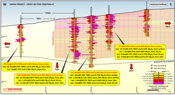 Figure 6: Cross-section illustrating high-grade TREO intercepts (1% TREO cut-off) and high-grade Nb₂O₅ intercepts (0.2% Nb₂O₅ cut-off), together with the current MRE boundary, demonstrating westward expansion of the existing Mineral Resource. [St George Mining]