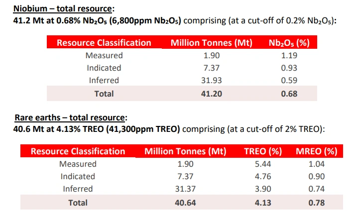 - Niobium: 41.2 Mt at 0.68% Nb₂O₅