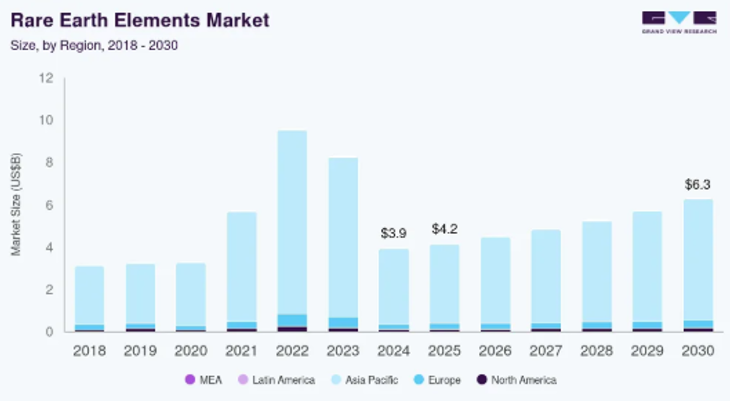 Asia-Pacific was the dominant region in the global supply chain, securing a revenue share of >86% in 2024. These materials are required to produce permanent magnets and battery alloys, which have many applications (see Figure below). China is the largest producer and consumer of rare earths. In addition, the ongoing geopolitical tensions between the U.S., China, and Europe have opened opportunities for new producers.