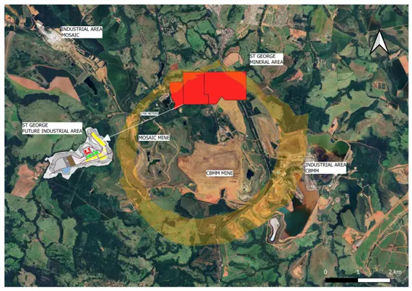 Figure 4: Aerial Earth image of the Barreiro carbonatite complex highlighting the Araxá Project (red outline), alongside the neighbouring CBMM niobium operation and Mosaic phosphate mine. [St George Mining Limited]
