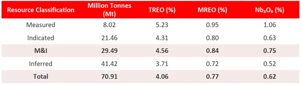 - Inferred: 41.42Mt at 3.71% TREO and 0.52% Nb₂O₅