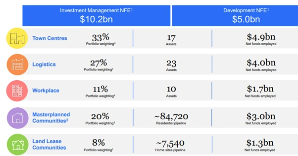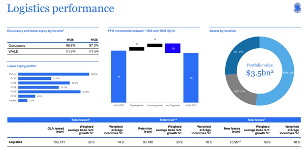 In the first half, logistics leased 169,731 sqm. Workplace leased 29,408 sqm. Retail centres had different mixes of tenants. Land Lease Communities had 100 per cent occupancy in 3,369 developed home lots.