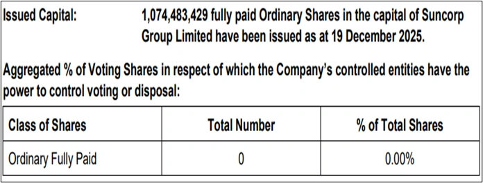 Ans. The Suncorp Section 259C(2) ASX update confirms zero voting shares held by controlled entities. The Suncorp Group ASX disclosure reports no economic exposure through derivatives or internal shareholdings as at 19 December 2025.