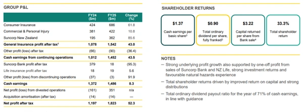 Suncorp delivered AUD 1,486 million in cash earnings for FY25. Net profit after tax reached AUD 1,823 million, up 52.3% on the prior year. The Company declared total ordinary dividends of AUD 0.90 per share, fully franked.