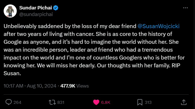 Figure 3: Sundar Pichai’s Tribute to the Death of Susan Wojcicki