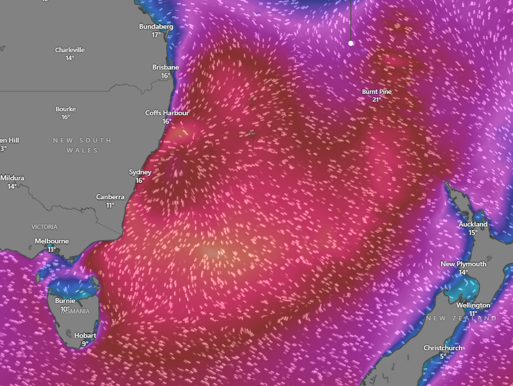 A weather map visualises intense wind and swell activity off the east coast of Australia, with powerful systems affecting areas from NSW to Victoria. [Source: Windy]