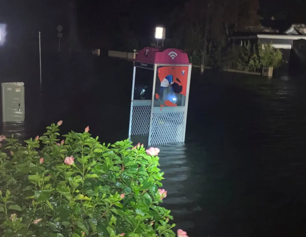 Floodwaters surround a phone booth outside the Rosie Oats café. [Photograph: Rian Gough]