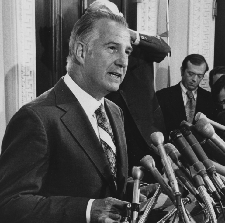 Former U.S. Vice President Spiro Agnew announcing his resignation on October 10, 1973.