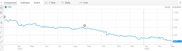 Ans. TWE last traded at $4.335, near the bottom of its 52-week range of $4.320 to $10.880.